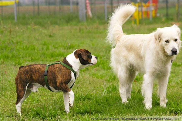 In this interaction between two males, the Beagle x Boston Terrier cross confronts the Golden Retriever, who reacts by maintaining a lateral stance and arching his neck.