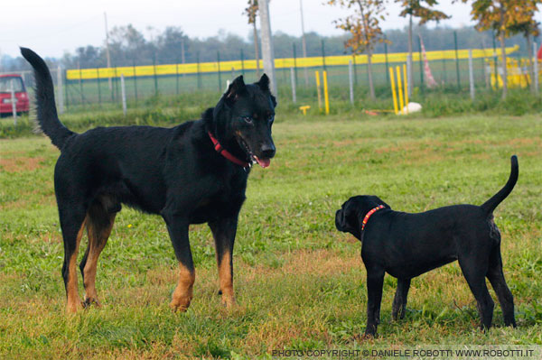 This Cane Corso puppy dares to exhibit an attack stance toward an adult Beauceron.