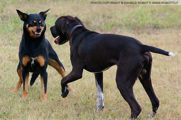 The male German Shepherd approaches the female Dobermann