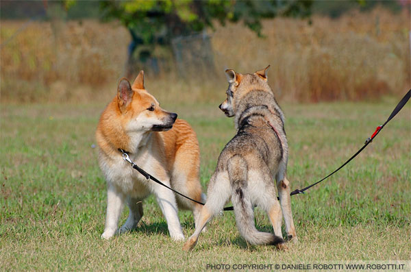 back-off posture. The male dog wags his tail