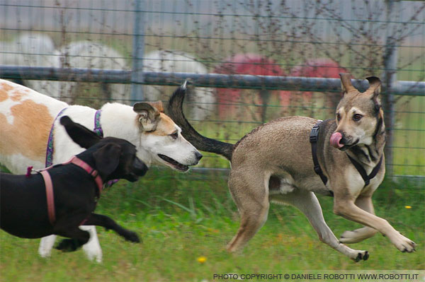 The female Czech Wolf Dog is chasing the mixed breed male. She is staring intently at his rear leg, showing the intention to bite the hindquarters of the dog she is chasing.