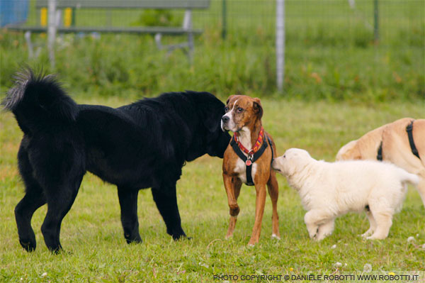 This female tawny Boxer mix is exhibiting freezing during olfactory exploration by a male Tibetan Mastiff and a Golden Retriever puppy.