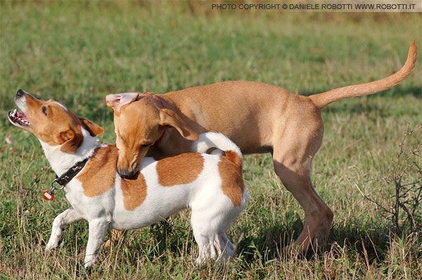 The young Segugio Italiano mix exhibits a hackle bite, grabbing the female Jack Russel by the shoulder / neck in play associated with stress. The Jack Russel reacts by raising her head and opening her mouth to show her discomfort.