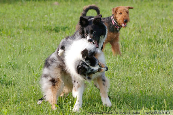 During a face off, the Australian Shepherd exhibits head down and towards his opponent; the Border Collie exhibits hugging and an open mouth display.