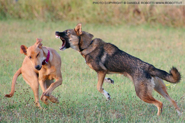 In this interaction between two females, the mixed breed on the right is lunging forward towards the Segugio Italiano mix, exhibiting an open mouth display and hackles raised. The Segugio mix reacts by swerving aside.