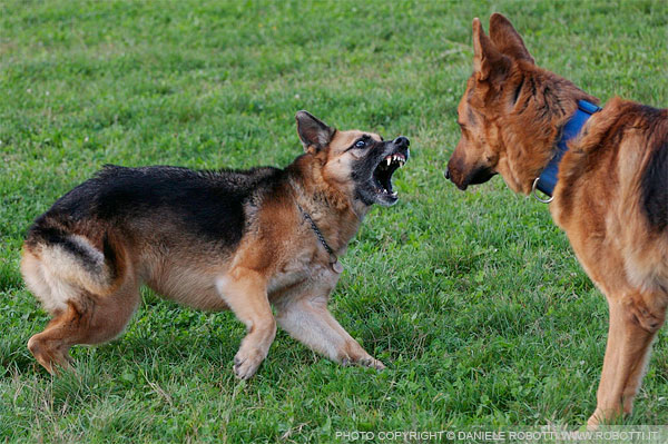 In this interaction between two German Shepherds, the female exhibits barking associated with an open mouth display as she swerves away from the male.