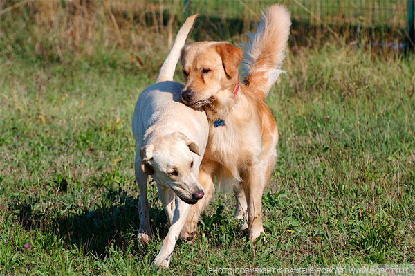 This female Labrador Retriever reacts to the approach of a Golden Retriever with a shoulder-hip slam.