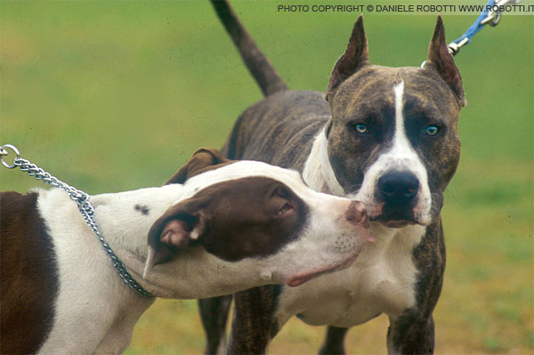 The male Pit Bull ignores the friendly overtures of the young male, and stares in the direction of the photographer, exhibiting a 'stone face'.
