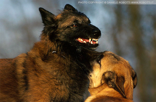 In this interaction between two males, the young Belgian Malinois Shepherd exhibits obnoxious submission and testing of the Belgian Tervueren. The Tervueren reacts with a defensive threat display.
