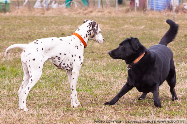 The Labrador puppy nears the black German Shepherd bitch, with lowered head. The Shepherd has a ball, and is controlling the resource. The puppy stops in frontal position, standing tall, and stares at the bitch, then lowers his head and moves nearer. The German Shepherd bitch grabs the ball, stares at the puppy and wags her tail. The puppy bows with front legs wide open, stares at the bitch and wags his tail. When the puppy lies down, the bitch releases her grip on the ball. The Shepherd bitch again picks up the ball, the puppy bows with front legs wide open, leaping and swerving to the side and bows again. He circles around her and shows anus-genital exploration. The bitch moves away. In the second episode, the puppy moves closer with lowered head and exhibits a bow, leaps in front of her and again displays a bow with front legs wide open. The puppy lies down, grabs a tuft of grass and, when the German Shepherd bitch moves away, he follows her. The Shepherd bitch changes direction and knocks him down. In the third episode, the puppy shifts to a frontal stance and bows with front legs wide open. He leaps sideways, then re-positions himself frontally and shows a bow with front legs wide open. When the puppy lies down, the bitch moves nearer and displaces him, nudging him with her nose and a paw press. The bitch again lies down, and the puppy circles around her, jumping. The bitch gets up and then lies down, re-positioning herself; the puppy approaches standing tall, then sits, scratches himself, and hops around until reaching a frontal stance, then displays a bow very close to the bitch.