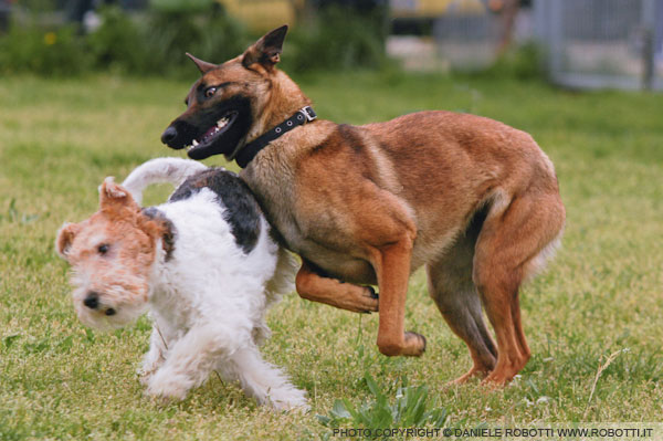 The female Belgian Malinois blocks the approach of a male Fox Terrier and causes him to move away by displaying a chest press.