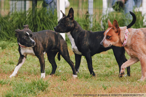 The female Staffordshire Bull Terrier and the female Australian Cattledog crowd the Staffordshire with the white stripe, who displays signs of fear.