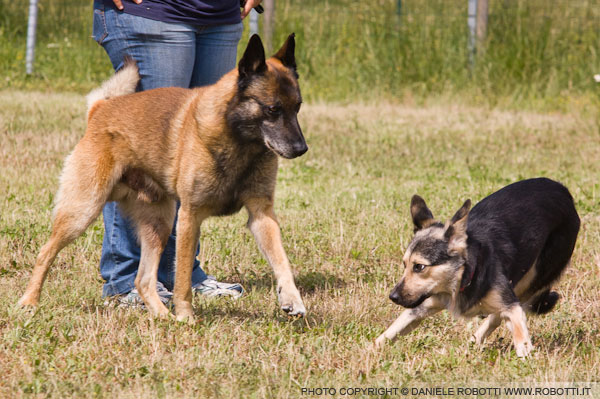 The male Belgian Malinois approaches and displaces the female German Shepherd cross.
