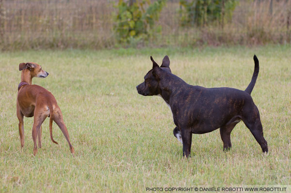 The Staffordshire Bull Terrier bitch approaches the small Italian Greyhound and displaces her.