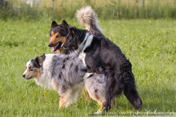 In this interaction between two males, the Border Collie exhibits dominance mounting towards the Australian Shepherd.
