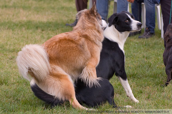 The mixed breed bitch exhibits dominance mounting towards the male smooth-coated Border Collie.