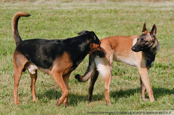 In this interaction between two males, the German Shepherd cross approaches the adolescent Belgian Malinois with a dominant approach and, after a brief olfactory exploration, turns toward the Malinois' head and, standing tall, stares.