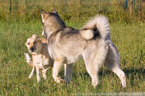 In this interaction between two females, the Alaskan Malamute moves toward the mixed-breed adolescent, displaying standing tall; the adolescent reacts by moving away and exhibiting behaviours indicating fear.