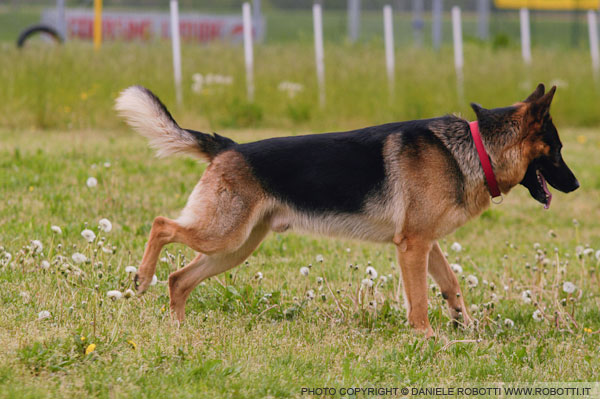 The male German Shepherd displays an eliminative paw scrape, staring at his opponent.
