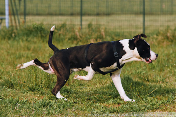The male American Staffordshire displays an eliminative paw scrape with great intensity.