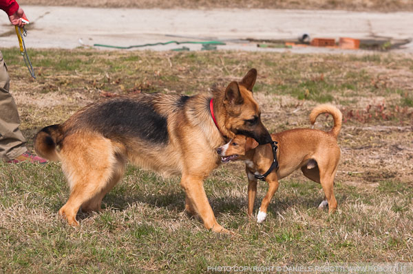In this interaction between two females, an adult and a puppy, the black German Shepherd has knocked down the running Malinois puppy, who is now sitting near the gate; the German Shepherd approaches and displays a head press. After sniffing the puppy, the Shepherd again displays a head press, then stops in a lateral stance. The puppy exhibits active submission, then scratches herself. The adult female approaches, towering over the puppy, who lies down. The adult presses the puppy down with her muzzle, sniffs her, and then leaves the interaction.