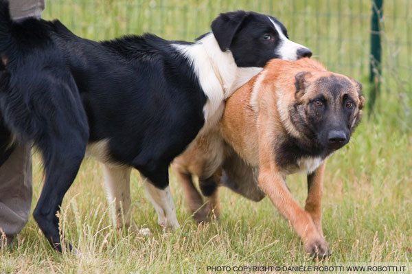 In this interaction between two males, the smooth-coated Border Collie displays a head press against the Belgian Malinois.