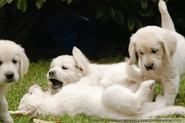During play, two Golden Retriever puppies show mobbing of their sibling.