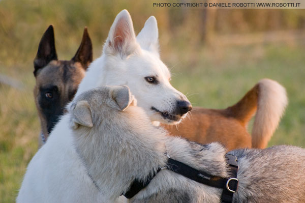 The female Czech Wolf Dog and the male Belgian Malinois display mobbing behaviour towards the Swiss White Shepherd bitch, who reacts by wrinkling her nose in a defensive threat display.