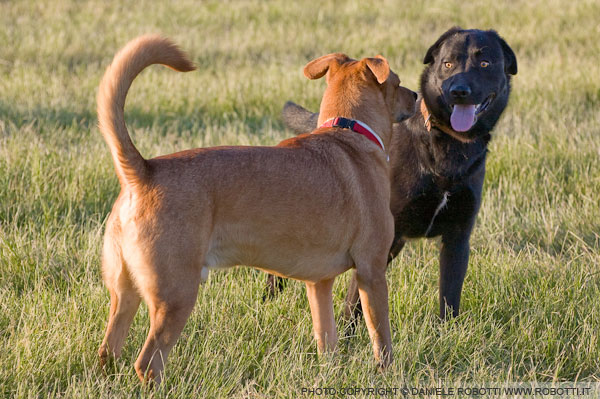 In this encounter between two males, the tan dog moves into position T1 while approaching the black dog and then displays a nose nudge to his shoulder.
