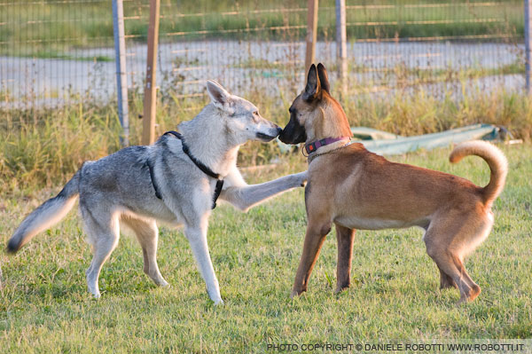 The female Czech Wolf Dog displays a paw press against the male Belgian Malinois.