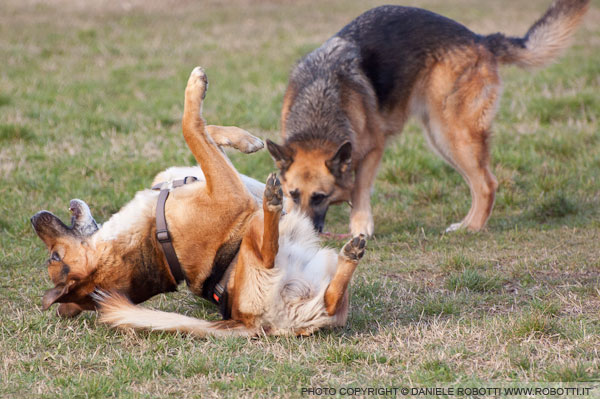 The dog positions itself in front of a dog or a person and rolls, sometimes kicking its legs and displacing its opponent with them.