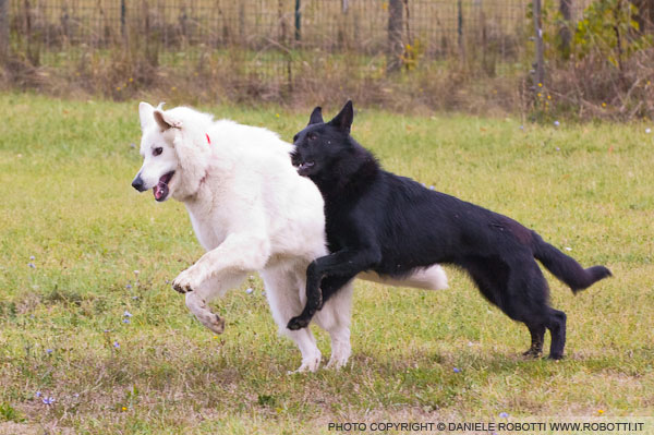 In this interaction between two females, the black German Shepherd uses physical contact to control the space in which the Swiss White Shepherd is moving.