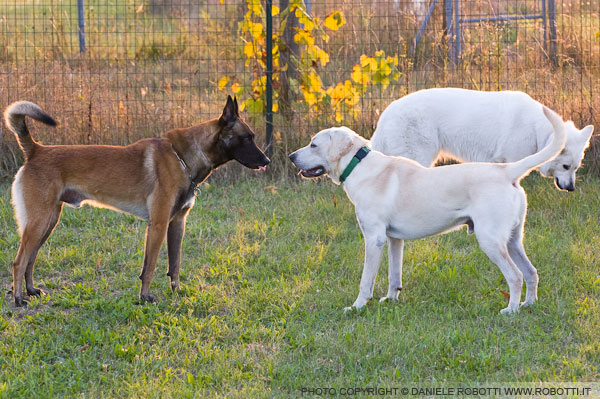 This young male Labrador Retriever stops the male Belgian Malinois with a frontal stance. The two dogs are competing for the Swiss White Shepherd bitch.