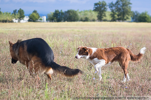 This male German Shepherd is defecating while the young Border Collie stares at him with a hard eye.