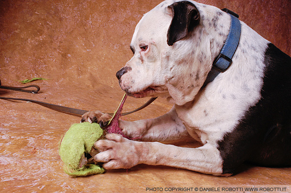This American Bulldog is destroying a toy.