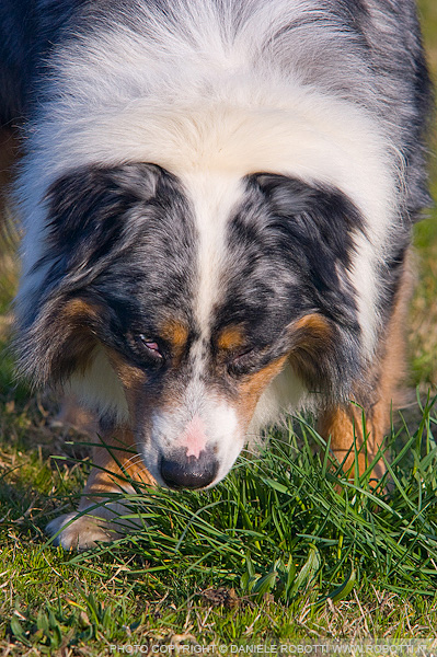This Australian Shepherd is eating grass as he glances at the photographer.