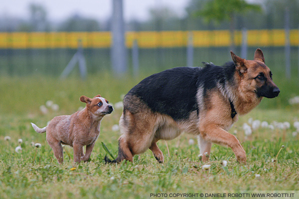 German Shepherd, who responds by moving away with