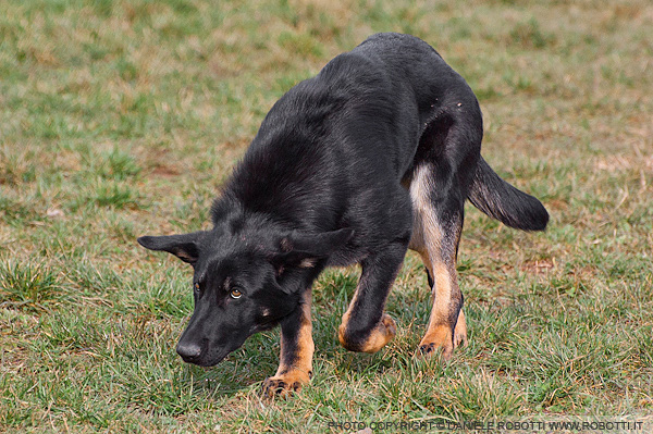 low posture as she encounters the male German Shepherd.