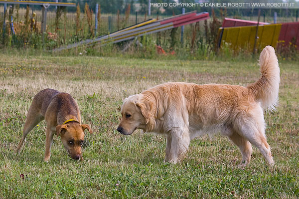The mixed breed male is sniffing the