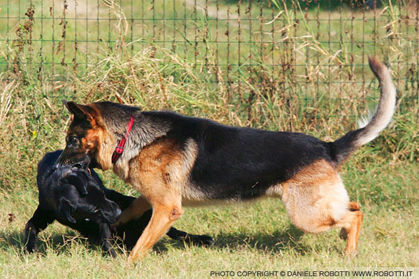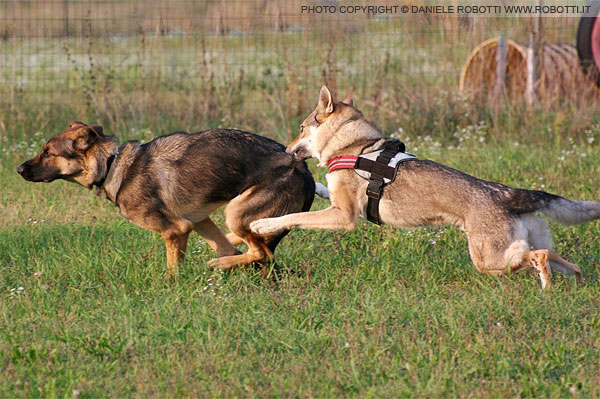 This female Czech Wolf Dog is biting the male German Shepherd dog as he attemps to run away.