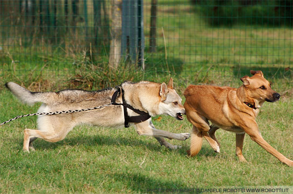 The female Czech Wolf Dog is chasing the mixed breed male. She is staring intently at his rear leg, showing the intention to bite the hindquarters of the dog she is chasing.