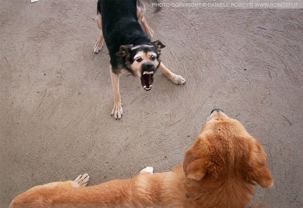 The female German Shepherd mix is exhibiting a threat display by gaping at the tawny mixed breed male, who reacts by staring directly at her from a lateral stance.