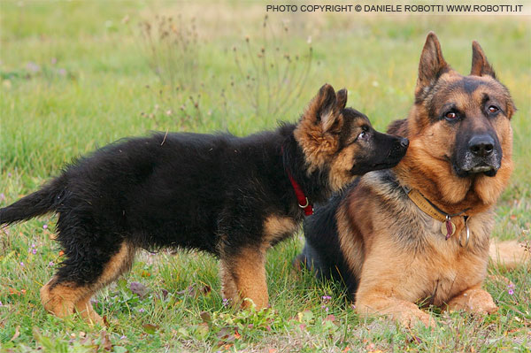 This German Shepherd puppy moves his head near the adult, staring at him. The adult reacts by arching his neck and glancing at the puppy.