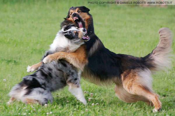 In this interaction between two males, the black and tan mixed breed hugs the Australian Shepherd, growling and exhibiting an open-mouth display.