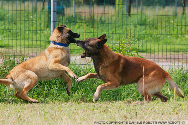 The male Belgian Malinois Shepherd on the right is exhibiting a leap forward with front paws wide open, and an open mouth display toward the female on the left, who reacts by rearing up and threatening to bite.