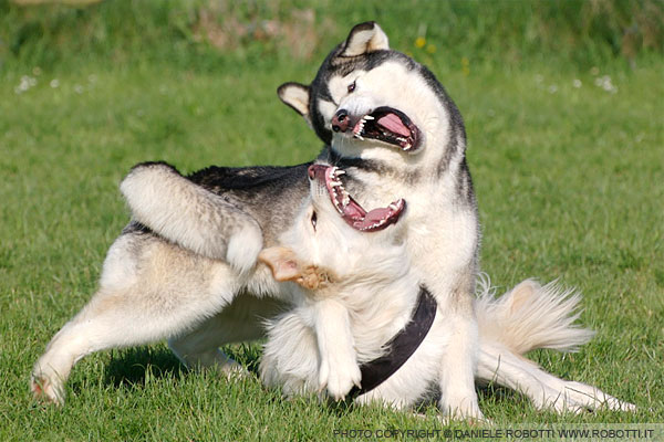 While I was analysing the video footage of aggressive interactions frame by frame, I realised that in most cases the dogs opened their mouths as if their intention was to bite, but then closed their mouths before entering into contact with their opponent. Even in the case of impressive displays such as that between this Malamute and village dog, the behaviour is, in reality, a demonstration of strength and aggressiveness.