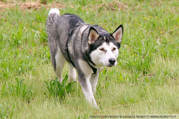 The female Husky mix has oriented towards another dog.