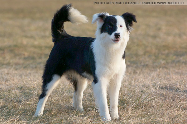 The young female Border Collie has oriented towards an unfamiliar dog and is demonstrating alarm. She is standing tall in a back-off posture, and is about to bark.