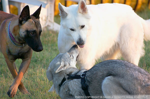 In this interaction between two females, the Czech Wolf Dog exhibits obnoxious submission and testing toward the White Swiss Shepherd.