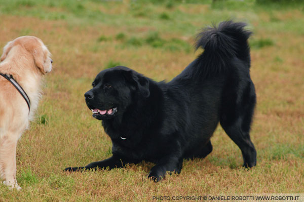 The young male Tibetan Mastiff displays a bow with front legs wide open in front of an adult female Golden Retriever, who averts her gaze, avoiding eye contact, and maintains a frontal stance.